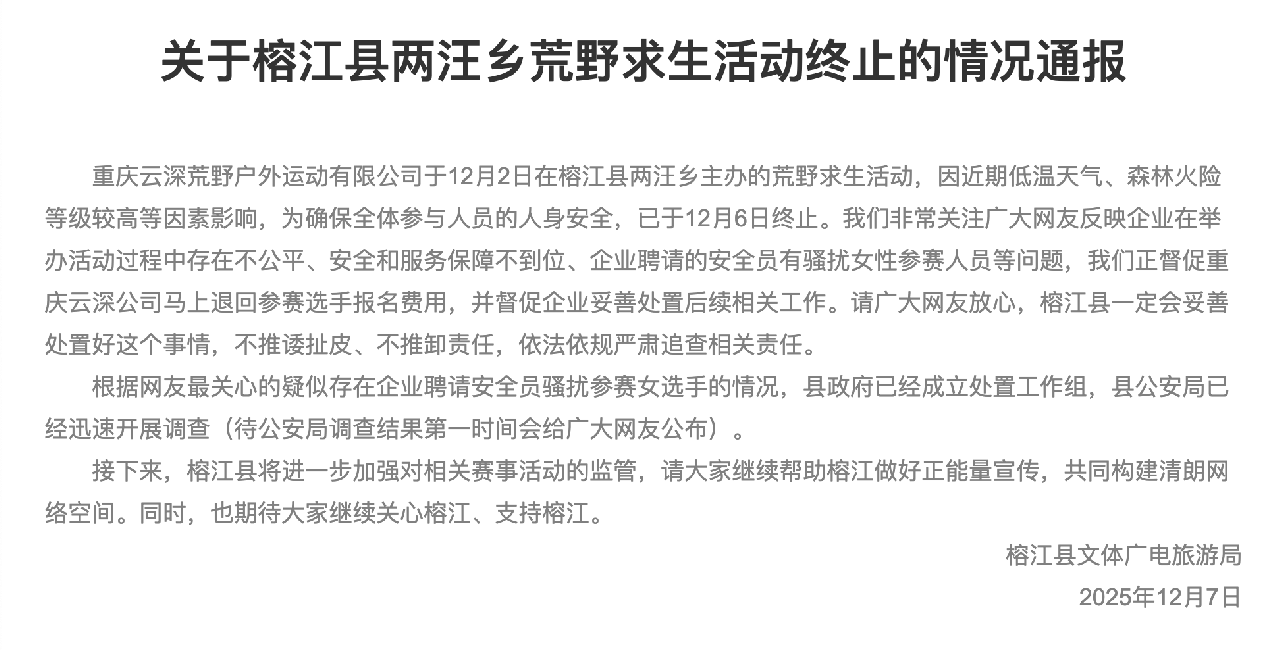 就在围绕贵州榕江版丛林赛的争议不断发酵的同时,出现“保安人员触摸女选手”、“部分选手作弊”等现象,当地政府(12月6日)以“出于安全考虑,气温过低”为由暂停了比赛。主办方今日证实,已有不止一例女选手受到影响,目前正在等待当地政府解决问题。在这段混乱的时期,外界注意到距离比赛只剩下4天了(直到12月6日,政府暂停了比赛)。 “你从一把刀开始,一切装备都靠磨练。”自张家界七星山荒野生存大赛火爆以来,“荒野求生”已成为旅游萨文化新趋势,各类资本云集加入游戏。利用山林资源举办赛事吸引流量是新途径虽有尝试,但不少赛事急于求名、赚快钱,早已偏离了初衷:云南花木兰安全赛因天气灾害被迫暂停。湖南惠化“频道杯”森林生存大赛中,一名选手的避难所发生火灾;在浙江瑞安举行的海岛生存比赛中,一名选手被二度烧伤。一些组织根据简陋的海报迅速组织比赛,甚至没有办理报名手续。如果荒野求生赛事的管理也一再向“野”的做法点头,最终沦为“寻险交通”,这不仅会超越赛事的声誉,也会忽视参与者的生命权。编辑:陈嘉文 编辑:陈毅